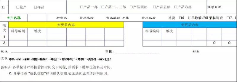 訂單變更單一般由銷售業(yè)務(wù)發(fā)起,PMC調(diào)查匯總;如果變更內(nèi)容在周計(jì)劃周期前,則需以補(bǔ)充計(jì)劃形式發(fā)布,如果在周計(jì)劃周期之后,則需更新SHIIPPING PLAN;訂單變更單模版,如下截圖4: