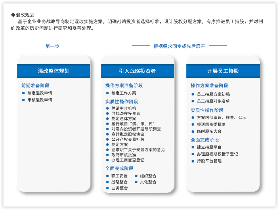 黨的十九大報告指出:“要深化國有企業(yè)改革,發(fā)展混合所有制經(jīng)濟,培育具有全球競爭力的世界一流企業(yè)”;當前,隨著國企改革“雙百行動”、區(qū)域性國資國企綜合改革試驗、“科改示范行動”、第三批以及第四批混改試點的實施,國企改革由點向面梯次鋪開、范圍逐步擴大,并呈現(xiàn)明顯加速,國有企業(yè)改革進入“深水區(qū)”。追本溯源,國企改革到底怎么改,回到國有企業(yè)改革的初衷我們認為,國有企業(yè)改革是以混和所有制為手段,在堅持黨的領導下建立現(xiàn)代企業(yè)制度,優(yōu)化管理關系,創(chuàng)新管理機制,激發(fā)員工活力,從而最終實現(xiàn)國有企業(yè)的持續(xù)發(fā)展?;旄穆鋵嵉骄唧w實踐中,便處處是難點。遠大方略認為,混改的重點已經(jīng)從以“政策研究+方案制定”為主轉(zhuǎn)變到以化解落地過程中的實際痛點為主,從剖析“為什么混、和誰混、怎么混”轉(zhuǎn)變?yōu)槁鋵嵵卫斫Y構、戰(zhàn)略協(xié)同以及激勵機制等深層次問題。