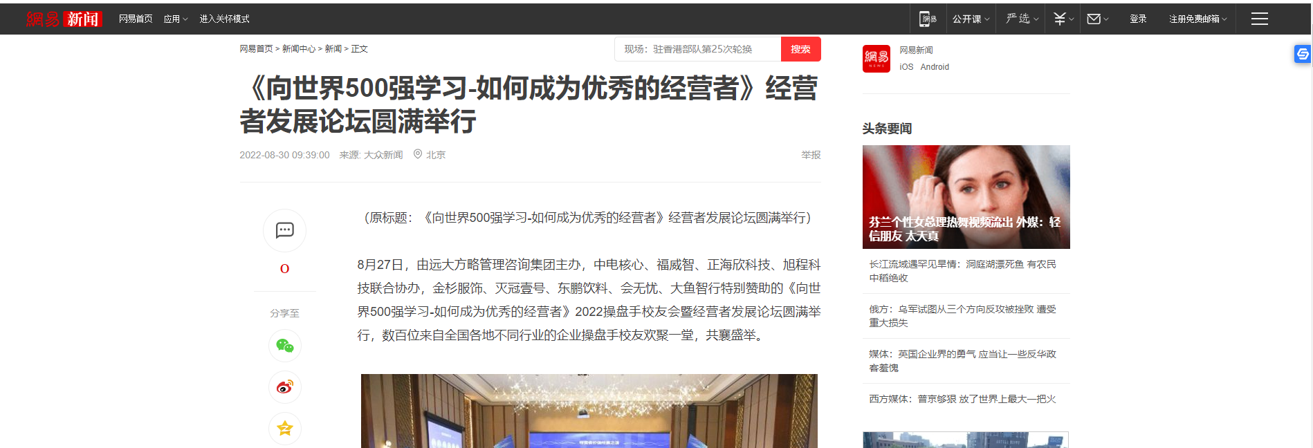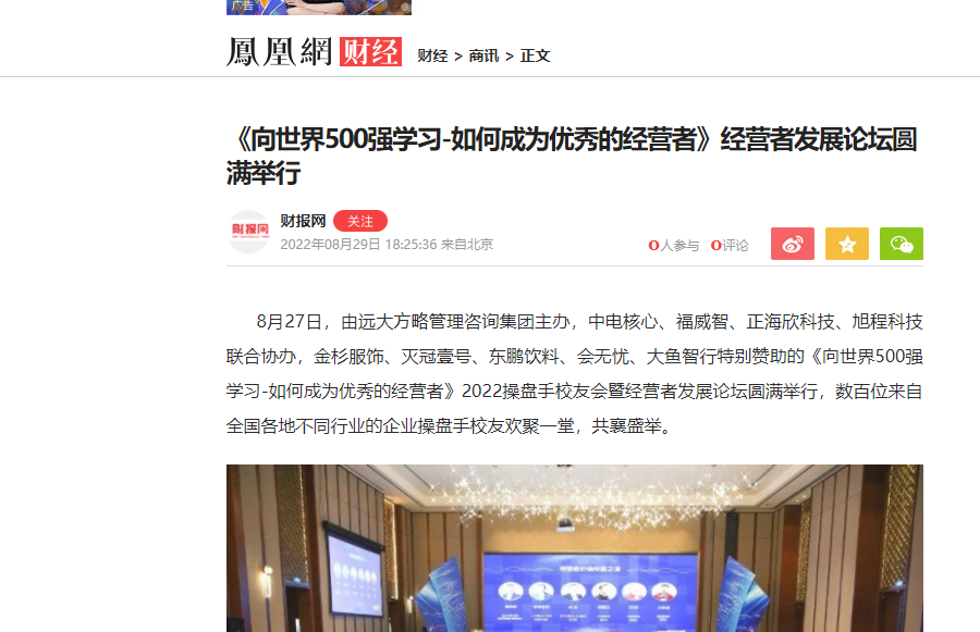 8月27日,由遠大方略管理咨詢集團主辦,中電核心、福威智、正海欣科技、旭程科技聯(lián)合協(xié)辦,金杉服飾、滅冠壹號、東鵬飲料、會無憂、大魚智行特別贊助的《向世界500強學習-如何成為優(yōu)秀的經營者》2022操盤手校友會暨經營者發(fā)展論壇圓滿舉行,數(shù)百位來自全國各地不同行業(yè)的企業(yè)操盤手校友歡聚一堂,共襄盛舉。