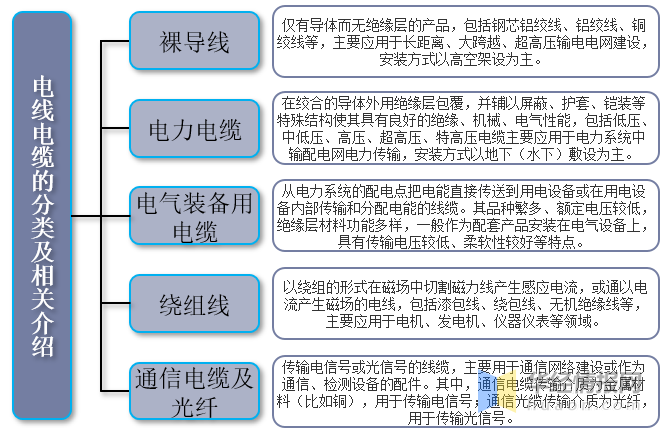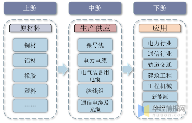 電線電纜行業(yè)產(chǎn)業(yè)鏈上游主要為銅材、鋁材、橡膠、塑料等原材料;中游為電線電纜生產(chǎn)供應(yīng)環(huán)節(jié),主要產(chǎn)品包括裸導(dǎo)線、電力電纜、電氣裝備用電纜、繞線組、通信電纜及光纖;下游廣泛應(yīng)用于電力、通信、軌道交通、建筑工程、工程機(jī)械、新能源等領(lǐng)域。