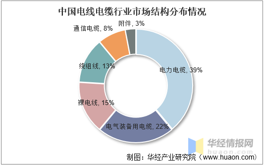 從我國(guó)電線電纜市場(chǎng)結(jié)構(gòu)來(lái)看,目前,電力電纜是行業(yè)市場(chǎng)占比最大的細(xì)分領(lǐng)域,占比達(dá)39%,其次為電器裝備用電纜和裸電線,占比分別為22%和15%。