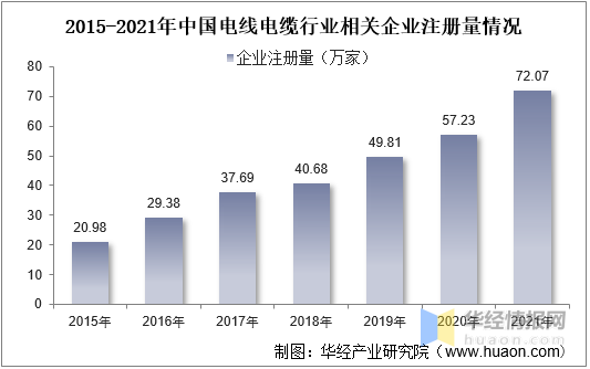 隨著我國(guó)電線電纜行業(yè)的快速發(fā)展,行業(yè)新增企業(yè)數(shù)量不斷增長(zhǎng)。據(jù)資料顯示,截至2021年底,我國(guó)電線電纜行業(yè)相關(guān)企業(yè)注冊(cè)量達(dá)72.07萬(wàn)家,同比增長(zhǎng)25.9%。