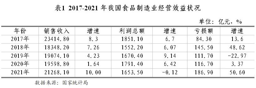 2021年,全國(guó)食品制造業(yè)銷售收入為21268.10億元,同比增長(zhǎng)10.00%;行業(yè)利潤(rùn)總額為1653.50億元,同比下降0.12%;行業(yè)虧損總額為186.90億元,同比增長(zhǎng)50.60 %。