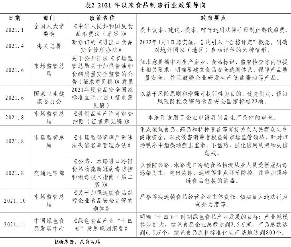 2021年,我國(guó)宏觀政策效應(yīng)持續(xù)顯現(xiàn)為食品制造行業(yè)帶來(lái)積極作用,行業(yè)監(jiān)管政策主要圍繞加強(qiáng)食品安全監(jiān)管和推動(dòng)產(chǎn)業(yè)健康有序地向高質(zhì)量發(fā)展。