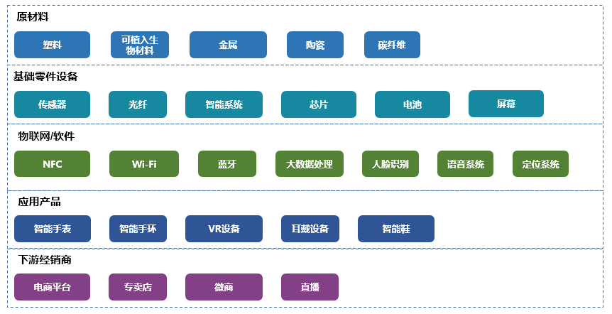 目前,可穿戴設(shè)備產(chǎn)業(yè)鏈包含了上游原材料,中游的基礎(chǔ)零件設(shè)備、物聯(lián)網(wǎng)/軟件、各種類型的產(chǎn)品(包括從芯片解決方案到外觀設(shè)計,再到生產(chǎn)組裝以及應(yīng)用開發(fā)等一系列流程),下游經(jīng)銷商等。