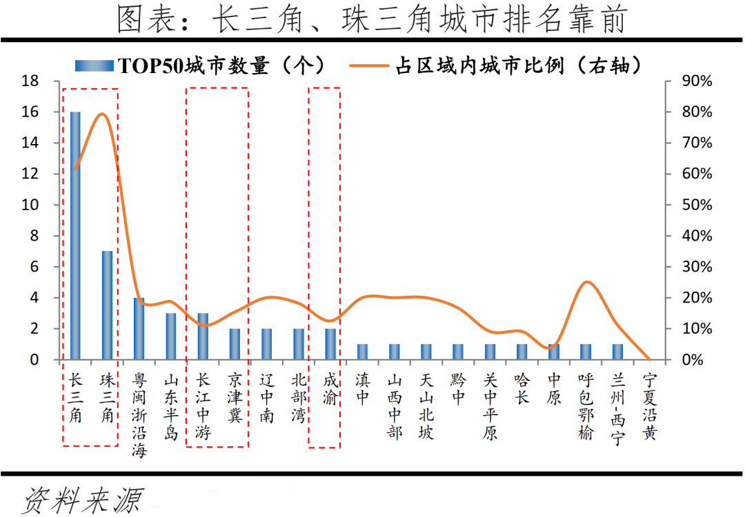 在發(fā)展?jié)摿OP50城中長三角、珠三角、京津冀、長江中游、成渝城市群內城市數(shù)量分別為16、7、2、3、2個,占區(qū)域城市總量比例分別為61.5%、77.8%、15.4%、11.1%、12.5%,長三角、珠三角城市群起步較早,發(fā)展相對成熟,資源集聚能力較強,區(qū)域城市總體排名靠前。