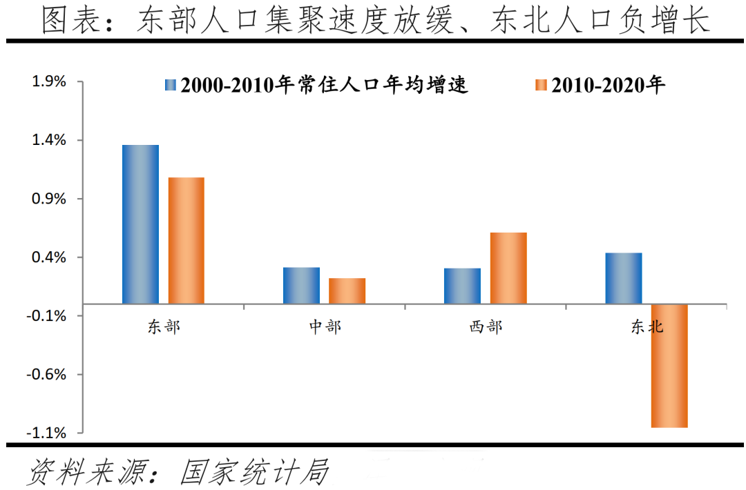 2010年以來,隨著沿海地區(qū)產業(yè)轉型升級、中西部地區(qū)產業(yè)承接以及老一代農民工老化,部分人口逐漸回流中西部,東部人口增速總體減緩,而東北地區(qū)人口開始負增長。