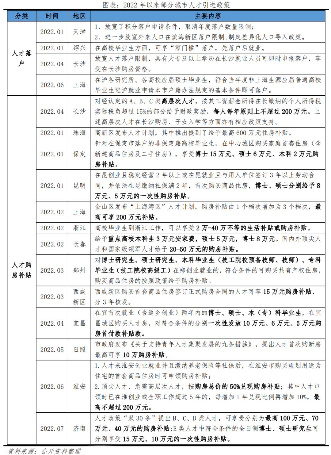 2017年初以來,各地掀起“搶人大戰(zhàn)”,城市人才競爭不斷升級,2022年以來各地人才政策不斷優(yōu)化,包括放寬人才落戶政策、提供租購房補貼、創(chuàng)業(yè)補貼等,逐漸從“搶人”向“搶人才”轉變。