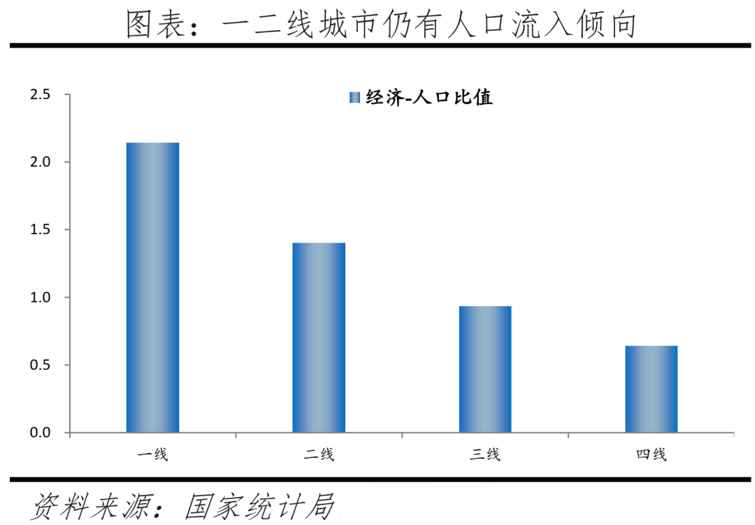 經濟-人口比值方面,一線、二線、三線、四線城市的經濟-人口比值分別為2.1、1.4、0.9、0.6。