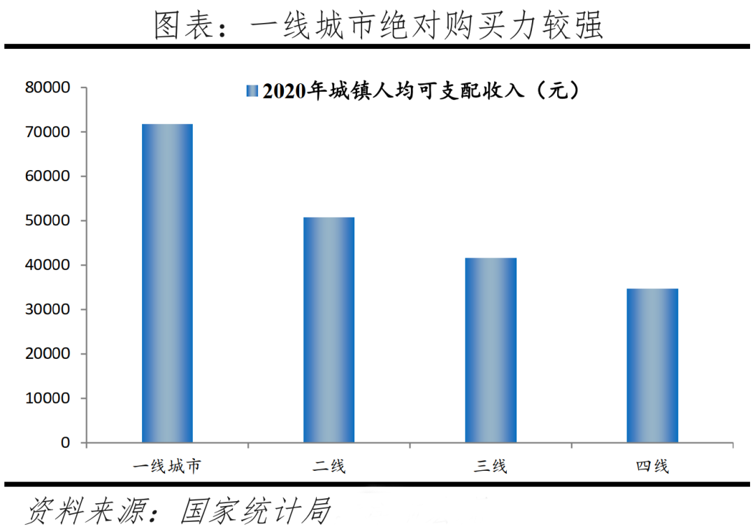 絕對購買力包括收入和存款,2020年一線、二線、三線、四線城鎮(zhèn)人均可支配收入分別為7.2、5.1、4.2、3.5萬元。