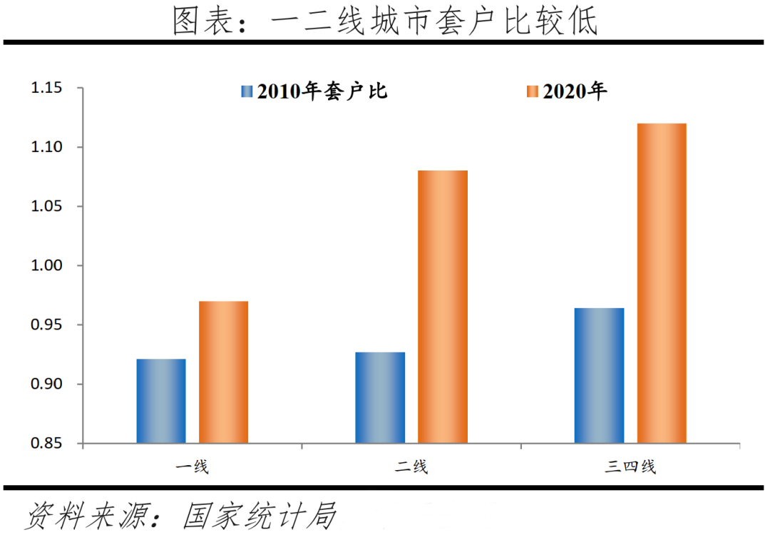 我們在《中國住房存量報告2021》估算了2020年各省級、地級單位城鎮(zhèn)住宅套戶比。分線看,2020年一線、二線、三四線城鎮(zhèn)人均住房建筑面積分別為26.4、34.6、37平米;套戶比分別為0.97、1.08、1.12。分地區(qū)看,2020年東部、中部、西部、東北地區(qū)城鎮(zhèn)人均住房建筑面積分別為32.4、37.6、34.3、29.8平;套戶比分別為1.01、1.10、1.08、1.13。