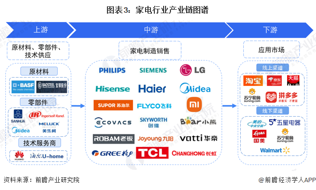 小家電產(chǎn)業(yè)鏈主要分為上游原材料和零部件供應(yīng)、中游小家電制造和下游小家電銷售三大環(huán)節(jié)。小家電行業(yè)上游原材料和零部件包括電加熱器、電器閥件、塑料、金屬材料、包裝材料等各類零部件供應(yīng)商,由于各種不同小家電所需原材料零部件不同,因此上游覆蓋企業(yè)范圍較廣,品牌也較多元化;中游小家電制造企業(yè)包含了國外大企業(yè)(如飛利浦)和國內(nèi)家電綜合制造企業(yè)(如美的)、小家電制造企業(yè)各類型企業(yè);下游主流銷售渠道有綜合電商平臺(如天貓商城、京東商城等)、線下家電賣場(如蘇寧、國美)、大型商超、各級經(jīng)銷商門店、公司直營門店等各類分銷渠道。