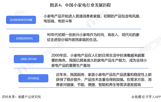 中國小家電行業(yè)發(fā)展歷程可以分為四個階段,20世紀80年代中期小家電產(chǎn)品開始進入普通消費者家庭,初期的產(chǎn)品包含電風(fēng)扇、電飯鍋、電熨斗等;20世紀90年代新興小家電作為時尚的象征開始走入城市居民生活;2000年后,小家電產(chǎn)品在人們的日常生活中扮演著越來越重要的角色,中國也開始成為小家電重要的生產(chǎn)基地;2010年后,產(chǎn)品質(zhì)量和穩(wěn)定性穩(wěn)步提高,健康、節(jié)能、便捷、智能和養(yǎng)生等需求也刺激行業(yè)進一步發(fā)展。目前行業(yè)進入多品類、高質(zhì)量、智能化的全新階段。