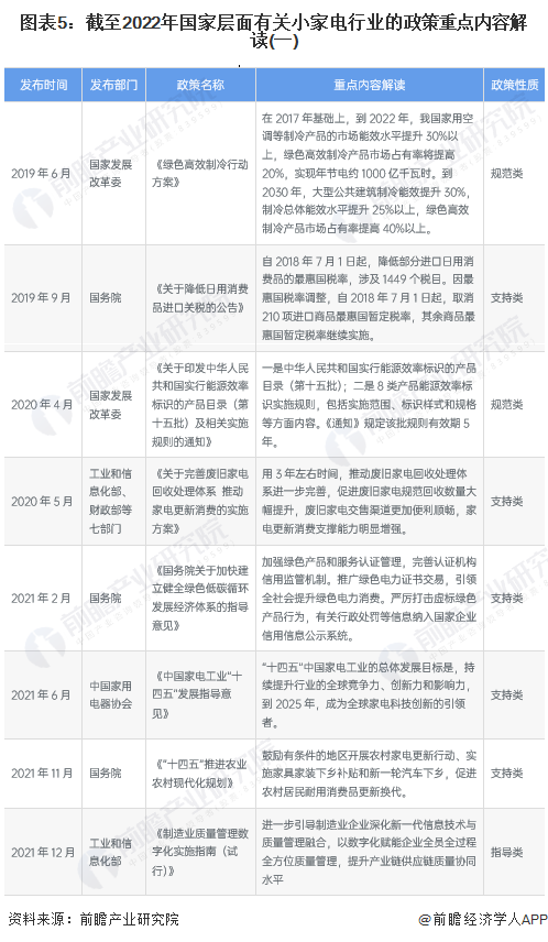 2022年1月,國家發(fā)改委擬定《關(guān)于做好近期促進消費工作的通知》,鼓勵有條件的地方開展綠色智能家電下鄉(xiāng),通過企業(yè)讓利、降低首付比例等方式,促進農(nóng)村居民消費。支持家電、家具等企業(yè)開展“以舊換新”、“以換代棄”活動,加強家電安全使用年限標準等宣傳解讀,鼓勵家電合理更新。2022年一季度,中國境內(nèi)零星爆發(fā)新型冠狀肺炎疫情導(dǎo)致經(jīng)濟增長受阻,國務(wù)院也于2022年5月制定了一攬子穩(wěn)住經(jīng)濟的政策措施,其中提及穩(wěn)定家電產(chǎn)品的消費??偨Y(jié)梳理來看,近年來國家層面對于小家電行業(yè)的政策關(guān)鍵詞在于:新一輪家電下鄉(xiāng)、以舊換新、補貼消費、家電回收。