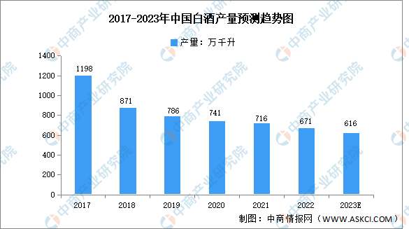 在消費市場環(huán)境變化、年輕消費者口味變化、限制“三公”消費、“禁酒令”等多方面因素的影響下,我國白酒產(chǎn)量逐年下降。2022年,全國白酒累計產(chǎn)量671萬千升,同比下滑5.6%。這是2017年以來全國白酒產(chǎn)量連續(xù)第六年下跌。預(yù)計2023年我國白酒產(chǎn)量616萬千升。
