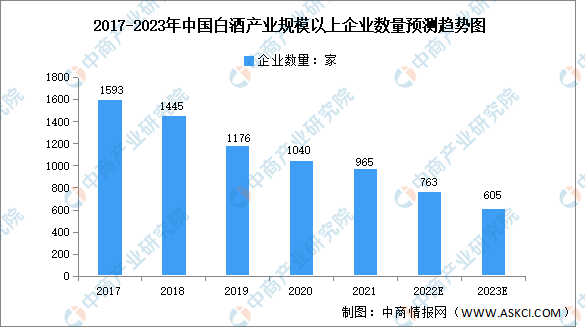 我國白酒產(chǎn)業(yè)規(guī)模以上企業(yè)數(shù)量呈下降趨勢,由2017年的1593家降至2021年的965家,現(xiàn)有企業(yè)競爭激烈,白酒產(chǎn)業(yè)集中度進一步提升。預(yù)計2023年我國白酒產(chǎn)業(yè)規(guī)模以上企業(yè)數(shù)量605家。