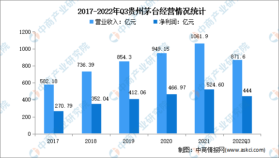 貴州茅臺主導產(chǎn)品“貴州茅臺酒”是世界三大蒸餾名酒之一,也是集國家地理標志產(chǎn)品、有機食品和國家非物質(zhì)文化遺產(chǎn)于一身的白酒品牌。2021年,貴州茅臺累計實現(xiàn)白酒產(chǎn)量17.1萬噸,實現(xiàn)營業(yè)收入1061.9億元,凈利潤達524.6億元。2022年前三季度實現(xiàn)營業(yè)收入871.6億元,凈利潤444億元。