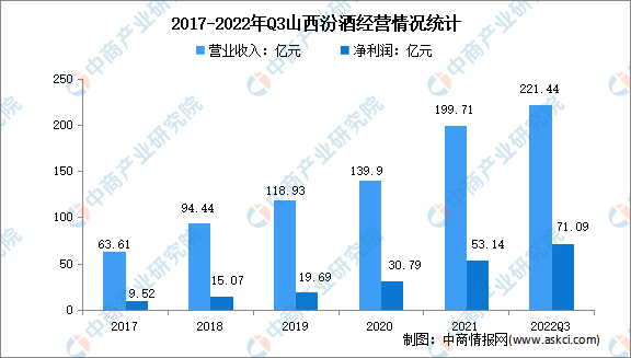 山西汾酒的主要產(chǎn)品汾酒是我國清香型白酒的典型代表,竹葉青酒是著名的保健養(yǎng)生酒,在國內(nèi)外享譽盛名。山西汾酒2021年實現(xiàn)營業(yè)收入199.71億元,凈利潤53.14億元。2022年前三季度實現(xiàn)營業(yè)收入221.44億元,實現(xiàn)凈利潤71.09億元。