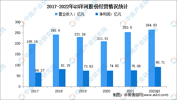 洋河股份是全國大型白酒生產(chǎn)企業(yè),是白酒行業(yè)唯一擁有洋河、雙溝兩大中國名酒,兩個中華老字號,六枚中國馳名商標的企業(yè)。洋河股份主導產(chǎn)品夢之藍、天之藍、海之藍、蘇酒、珍寶坊、洋河大曲、雙溝大曲等系列白酒,在全國享有較高的品牌知名度和美譽度。2021年,洋河股份營業(yè)收入達253.5億元,凈利潤達75.08億元。2022年前三季度,洋河股份實現(xiàn)營業(yè)收入264.83億元,凈利潤達90.71億元。