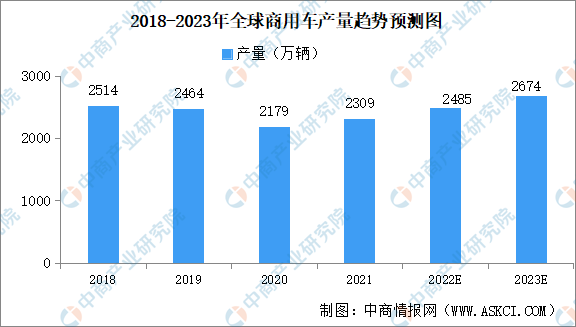 2018-2021年全球商用車(包括輕型商用車、重型卡車、客車巴士等)產(chǎn)量小幅波動。其中,受新冠肺炎疫情影響2020年全球商用車產(chǎn)量出現(xiàn)較大跌幅,產(chǎn)量降至2179萬輛。隨著世界工業(yè)生產(chǎn)與旅游業(yè)的逐步恢復(fù),2021年全球商用車產(chǎn)量相較于乘用車漲幅較大,商用車產(chǎn)量約為2309萬輛,同比增長6%。預(yù)計2023年全球商用車產(chǎn)量將增至2674萬輛。