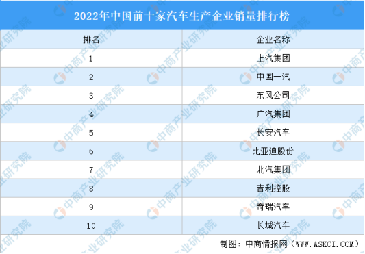 2022年,汽車銷量排名前十位的企業(yè)共銷售2314.8萬輛,占汽車銷售總量的86.2%。2022年前十家汽車生產(chǎn)企業(yè)分別為:上汽集團、中國一汽、東風(fēng)公司、廣汽集團、長安汽車、比亞迪股份、北汽集團、吉利控股、奇瑞汽車、長城汽車。