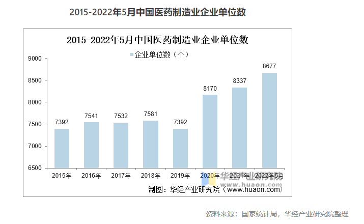 疫情前,受政策控制和行業(yè)嚴格監(jiān)管的影響,我國醫(yī)藥制造業(yè)企業(yè)單位數(shù)量較為穩(wěn)定,研發(fā)能力較弱的中小型企業(yè)逐漸退出市場,2020年疫情席卷全球,市場迫切需要大量藥品和疫苗研發(fā),企業(yè)數(shù)量開始增長,截止2022年5月我國醫(yī)藥制造業(yè)企業(yè)有8677家。