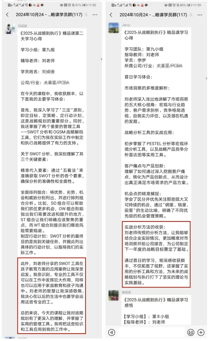 課程上老師理論與實戰(zhàn)案例相結(jié)合,通過對照標(biāo)桿,學(xué)習(xí)標(biāo)桿,不僅讓學(xué)員對理論知識的理解更加透徹,更讓學(xué)員找出了自身企業(yè)與標(biāo)桿企業(yè)的差距。為了讓培訓(xùn)更加落地,針對課程上的每個知識要點都設(shè)計了實戰(zhàn)演練環(huán)節(jié),現(xiàn)場學(xué)習(xí)現(xiàn)場實操,老師一對一輔導(dǎo),幫學(xué)員答疑解惑,讓學(xué)員真正掌握戰(zhàn)略制定到落地的核心方法。