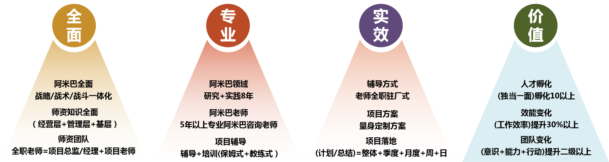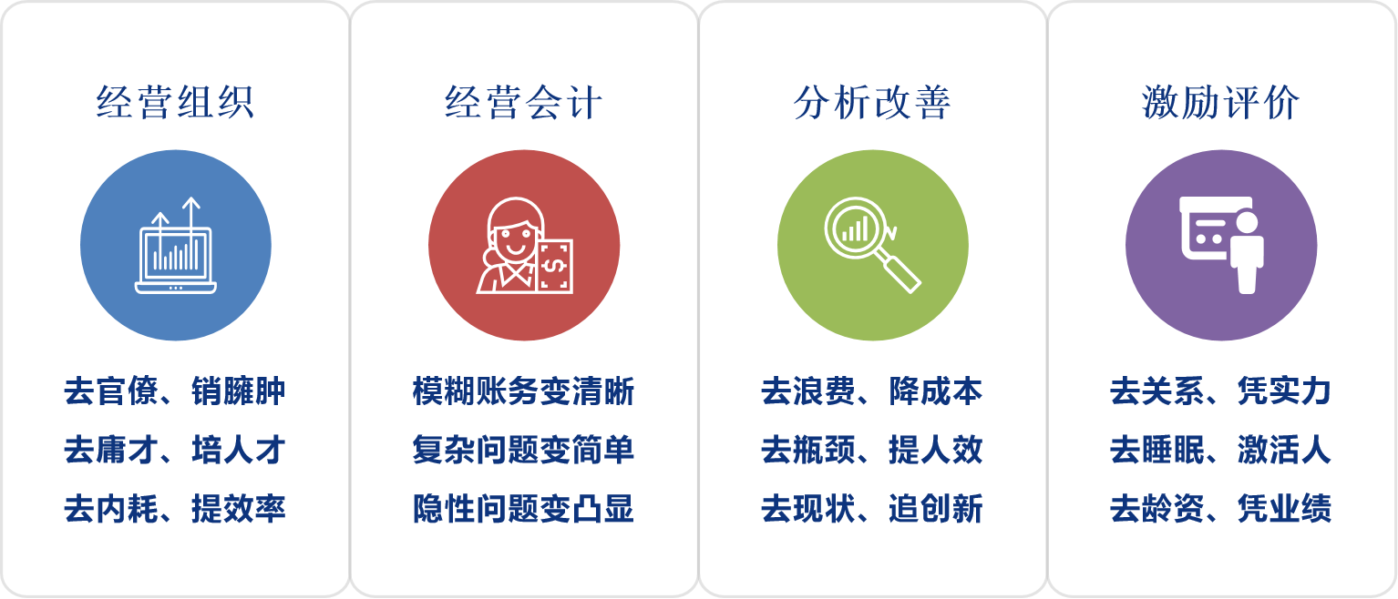 4、數(shù)據(jù)增長:(1) 公司高層、中層、基本價值觀高度統(tǒng)一;(2)公司企業(yè)文化清晰明確,提倡什么、禁止什么清楚明了;(3)組織架構(gòu)調(diào)整實施,責、權(quán)、利下放至各事業(yè)部;(4)事業(yè)部實現(xiàn)獨立財務(wù)核算;(5)事業(yè)部內(nèi)各阿米巴實現(xiàn)獨立財務(wù)核算;(6) 人才培養(yǎng)機制初步形成;(7) 持續(xù)降低成本的自主運營機制初步建立;(8)公司利潤率提升5%,凈利潤提升80%。